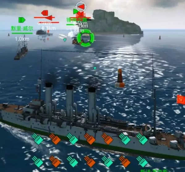 5、怎样提升输出效率?在海战里有个叫T头的战术,就是让我方战舰的侧舷对着敌方的船头,这样船首和船尾的炮塔就能同时进行射击。从图中可以看到,把战舰转到侧身状态后,能够开炮的炮塔数量会明显增加,这时点击右下角的开炮按钮就能向敌人发起轰击了。