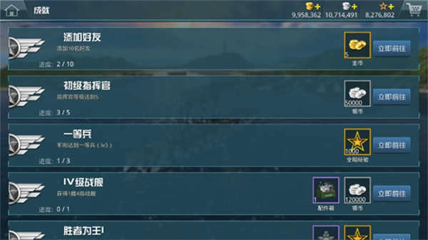 完成指定的成就任务就能获取对应的奖励,这些奖励不仅种类丰富,而且十分丰厚,涵盖了金币、银币、全局经验,另外还有配件箱、战舰订单、水兵调令等珍贵道具。