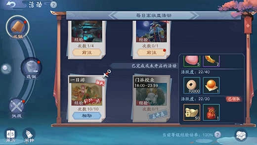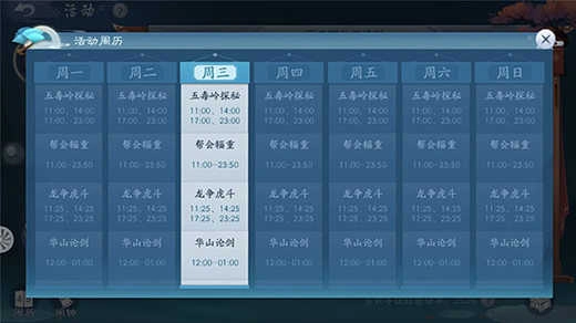 随着角色的成长,玩家将有更多机会参与到各种日常活动中。目前游戏提供了诸如一日游、寻龙探宝、江湖话本、门派修行、影宗悬赏、五霸岗除魔、门派授业等多种活动。此外,每周还会有特定时间段开放的限时活动,例如五毒岭探秘、龙争虎斗、华山论剑等。这些活动不仅能让玩家深入探索游戏世界,还能获取到提升战力所需的装备、物资以及侠客资源。