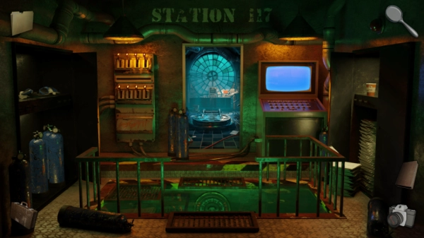 6、查看右侧柜子上潜水镜下方的纸条,依据纸条上的提示来拉动控制杆。