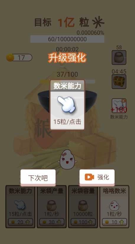 大米小目标是一款超有趣的休闲益智游戏,尽情施展你的才华,向着世界之王的目标迈进。只需简单点击并持续升级,出售收获的大米就能积累财富,助力设备水平飞速提升。游戏中还有诸多趣味挑战任务,为玩家带来充满欢乐的冒险体验,在不断更新与发展中收获满满的满足感。