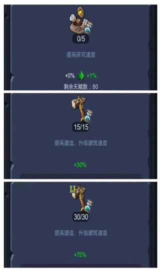通过完成任务和升级建筑,角色等级会随之提升,并获得天赋点数。天赋点能够大幅缩短建造时间。前期选择天赋时一定要谨慎,选错只能通过购买天赋重置功能重新选择,而重置需要花费较多资源,因此建议大家深思熟虑后再做决定!