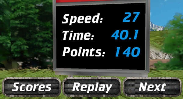 5、顺利抵达终点线即视为通关成功,此时可以查看自己的比赛数据,包括平均速度和总耗时等。若对成绩不满意可点击“replay”重新挑战,满意则点击“next”迈向下一关。