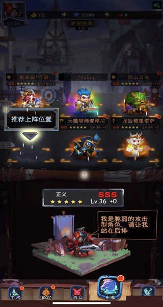 法术类输出英雄需要处于后排位置,像龙后、元素和魔导这类英雄,能对敌方后排造成强劲伤害,但自身生存能力较弱,且不适合搭配副手盾牌,所以只能待在后排。你可以点击游戏界面下方的阵容按钮,选择法术输出英雄并点击上阵,将其放置在两排中的下排任意位置即可;至于比较肉的英雄,则建议放在中间,与敌人的boss进行对位。