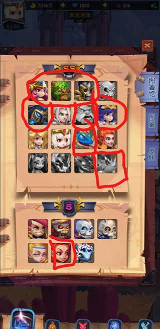 有用的英雄都已用红圈圈出,前期靠这些英雄推图就足够了。物理系的布鲁斯和罗杰