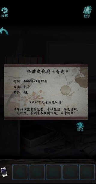 3、接着向东前进,在走廊上会看到一些新鲜的脚印,说明有人刚刚走过。但目前门被锁住了,进入房间后可以找到【经典皮影戏《奇迹》】票以及一台老式游戏机。