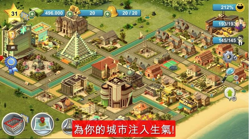 2、记得建筑物与装饰所摆放的位置要具策略性,以确保你的城市有充足的现金流持续发展。马上加入全球4千万名《岛屿城市》玩家,管理及发展属于你自己的城市吧!上线、离线都可以玩喔!