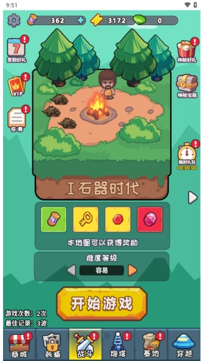 冒险之战是一款策略塔防闯关游戏。玩家意外穿越到原始时代,因语言不通遭野蛮人袭击。为在原始部落安稳生存,需建造弓箭塔逐步击退敌人;而为了回家,则要收集散落各地的电池修复时空穿越机器。然而野蛮人持续进攻,你能否找到回家的路?游戏采用卡通风格,以幽默风趣的方式展现原始时代的风貌。