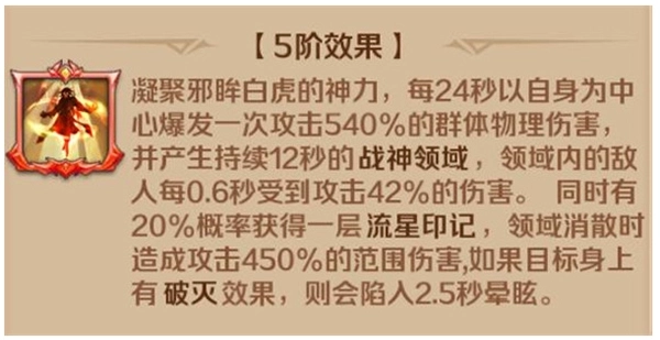 1阶效果和3阶效果的核心差异在于,3阶额外附带了一项特殊机制:战神领域消失的瞬间会释放一次380%的范围伤害,而带有破灭效果的目标会被眩晕2.5秒。考虑到SS戴沐白是群攻定位的魂师,破灭效果能够轻松覆盖敌方多名魂师,所以3阶的SS戴沐白在原本群攻爆发的特性之外,又新增了群体控制能力,真正实现了伤害与控制的双重结合。另外,当神技提升至5阶时,不仅能显著增强伤害输出,还能提高流星效果的触发概率。