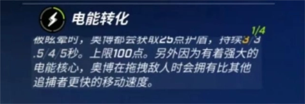被动天赋·电能转化:当奥博周围有敌人陷入眩晕状态时,自身将获得25点护盾值,护盾上限为100点,持续时间3至5秒。得益于体内强大的电能核心,奥博在拖拽敌人的过程中,移动速度会比其他追捕者更快。