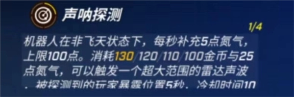 主动天赋-声呐探测:当机器人处于非飞行状态时,每秒会自动回复5点氮气,氮气的存储上限为100点。该天赋触发需消耗130/120/110/100金币与25点氮气,触发后会释放出超大范围的雷达声波,被声波探测到的玩家位置将暴露5秒,此天赋的冷却时间为10秒。