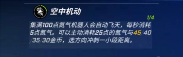 被动天赋-空中机动:当机器人的氮气值累积到100点时,会自动进入飞行状态,在此期间每秒消耗5点氮气。此外,还能主动消耗25点氮气和相应数量的金币(45/40/35/30),并选择方向进行短距离冲刺。