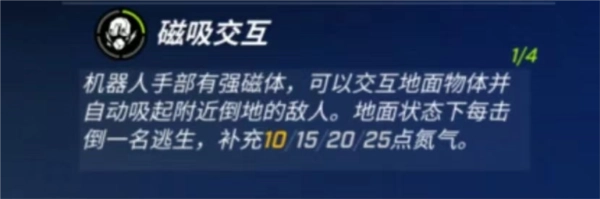 被动天赋-磁吸交互:机器人手部配备强磁体,能与地面物体产生交互,并自动吸附周边倒地的敌人。处于地面状态时,每击倒一名逃生者,将补充10/15/20/25点氮气。
