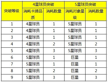 4星和5星品质的球星卡牌支持球员突破操作,该操作需消耗若干同品质或更高品质的卡牌。球员突破总计9个等级,每次突破至对应等级前,需先将球员等级强化到相应级别方可进行,且每次突破均需消耗一定数量的同品质或以上卡牌。
