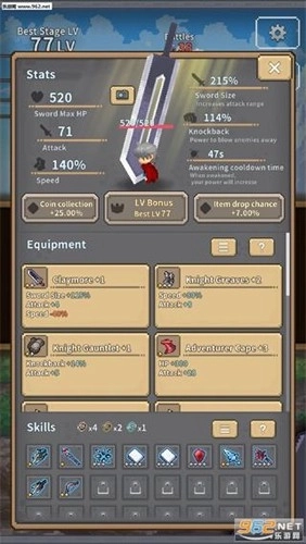 2、打开装备界面,对【太刃丸】和【骑士护腿+2】进行强化操作,以此提升它们的等级(上限为77级)和属性数值,同时解锁对应的技能。