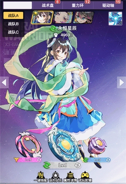 二、初始陀螺组装:游戏初期可借助“一键搭配”功能快速入门。该智能系统会依据你当前拥有的战术盘、重力环和驱动轴,为你量身打造一套合适的陀螺组合,帮助你快速搭建战斗基础。