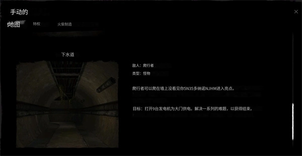 下水道(已翻译);怪物是爬行者;需要找到九台发电机来给大门供电。