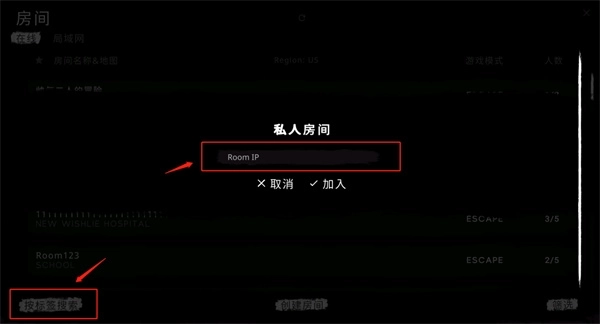 创建的房间包含医院、学校、下水道这三个地图,以及逃离、生存两种模式;根据参与的朋友数量选择对应人数的房间,需等人满后才能开始游戏。