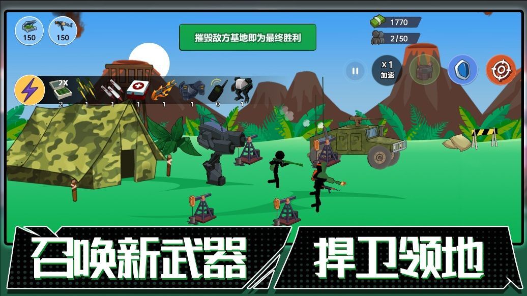 1、以火柴人世界为背景,将策略塔防与即时战略元素相融合,指挥军队守护部落、挽救家园。