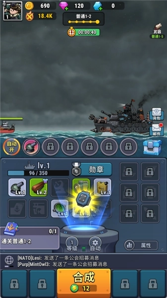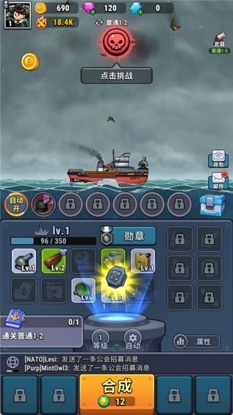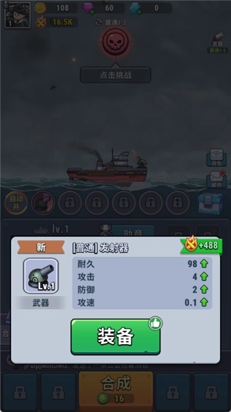 1、进入游戏界面后,点击【合成】按钮就能得到随机装备。这些装备本身带有属性值,要是你合成出了高等级的装备,可直接把它装配到战舰上,这样能使战力得到大幅提升。