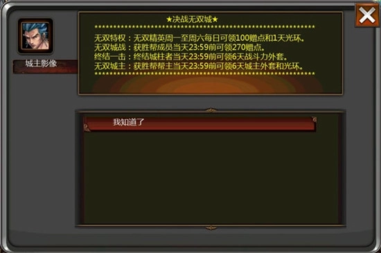 每周日20:30-21:00间,凡是加入帮派的侠士皆可以由双龙城的无双城统领处进入无双城,参加“决战无双城”活动,获得胜利的帮派将获得无双城的统治权,直至下一次决战无双城。在占领无双城的当天,所有帮派成员都可在23:59前领取270赠点。在占领期间的每周一至周六,无双精英每日都可领取100赠点和1天光环。除此之外,无双城主以及“终结一击”的贡献者都将获得额外的丰厚奖励,还不快快行动起来!