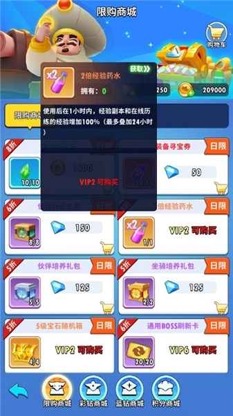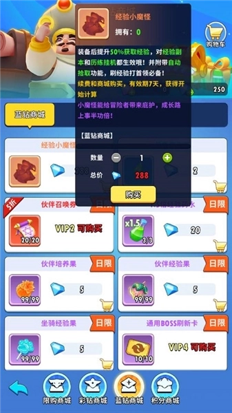 在进入经验副本和进行快速历练之前,一定要记得先使用经验药水。其中,1.5倍经验药水可以用钻石购买,2倍经验药水则需要用彩钻购买。