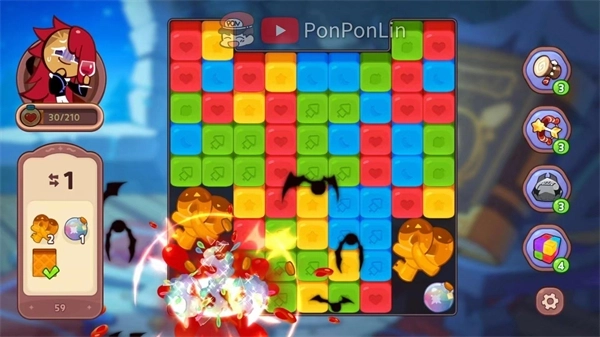 随着游戏进程推进,可搭配上场的饼干角色会越来越多,大家可以根据不同关卡的特点,选择1只特殊饼干参与战斗哦!(上图展示的是吸血鬼饼干,它能一次性消除固定5格的障碍物)