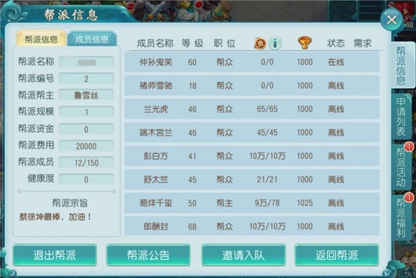 帮派健康度:完成帮派任务能够提升该健康度,而当维护资金不足时,健康度会被扣除。
