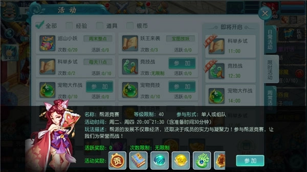 参与条件:人物等级≥40级,入帮2天以上可参加