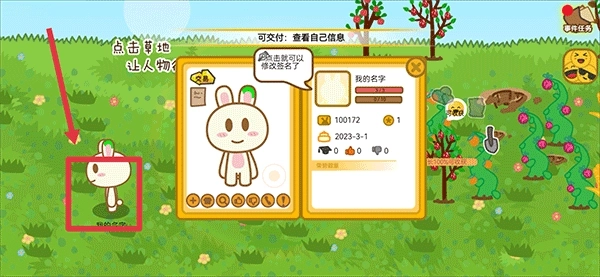 9、当需要修改角色名称或者查看个人信息时,点击兔子的肚子就能打开面板信息