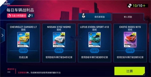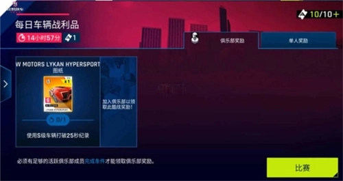 该赛事的奖励分为俱乐部奖励和单人奖励两类。单人奖励包含BCD等级的图纸,每项奖励下方都标注了对应的任务要求,比如使用D级车辆突破34秒纪录、驾驶C级车辆打破28秒纪录等,因此参赛时要仔细确认任务目标。此外还有俱乐部奖励,但需俱乐部内有足够多的活跃成员完成指定条件才能领取,这类任务的难度相对更高,例如要求拥有一辆S级车辆并突破25秒纪录等。