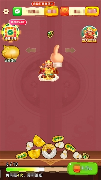 3、除了通过合成财神来提现,还能收集金币后按比例兑换提现,两种方式都是秒到账!