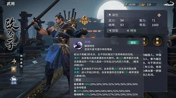 欧冶子是资质120的橙色武将,在游戏里被定位为具备强大全场输出能力的战士步将。游戏中他的人物建模身后背着五把亲手铸造的名剑,其特性剑技也与这些剑关联紧密。解锁该特性后,欧冶子会佩戴湛卢、龙渊、赤霄这三把自己铸造的名剑,每把剑对应着不同的战斗属性:湛卢能为他提升武力伤害,龙渊可在他生命值偏低时赋予生命夺取效果,赤霄则有几率在战斗中使敌人缴械。凭借这三把剑,欧冶子同时拥有了输出、防护与战术三种能力,因此是后期相当值得培养的武将。