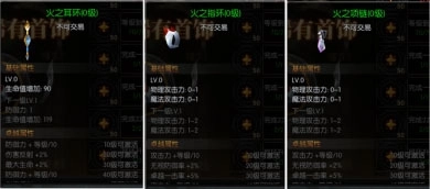 三种首饰因为部位不同,所以自带属性也各不相同。耳环为防御类型,属性为增加防御力及生命值;项链、指环为攻击类型,增加玩家的攻击力。并且由于项链只有一个,所以加的属性是要高于指环的。