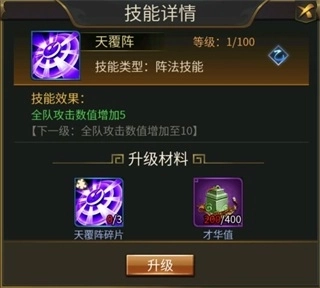 4、提升技能等级需消耗对应的阵法碎片与才华值,并且等级越高,所需消耗的材料数量就越多。拿天覆阵来说,从0级升到1级要消耗2个天覆阵碎片和200点才华值,从1级升到2级则需要3个天覆阵碎片和400点才华值。