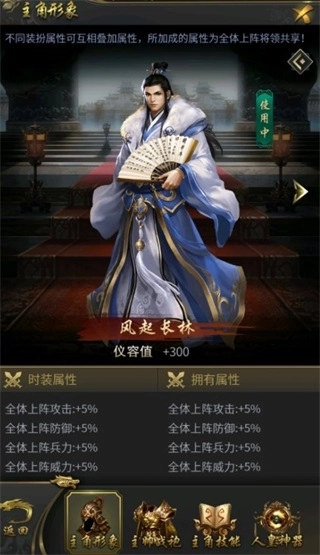 1、主公大人可在主界面点击“主公”雕像进入主角界面,在此能更换主角形象。主角形象的获取途径多样,包括晋级爵位、购买VIP礼包、榜单奖励等;其中稀有的主角形象还可为主公带来各类属性加成。