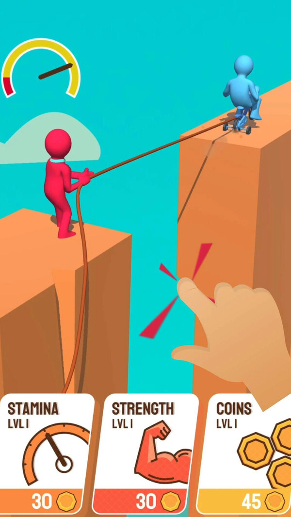 绳索战争是一款超有趣的休闲益智游戏,玩家将在悬崖边展开拔河对决,这是一场力量的比拼。游戏设有海量关卡,每个关卡的对手各不相同,可能是人类,也可能是火车之类的特殊对象。挑战胜利后,玩家能获取金币,用于持续提升自身各项属性,从而提高获胜几率,赶紧来试试吧!!!