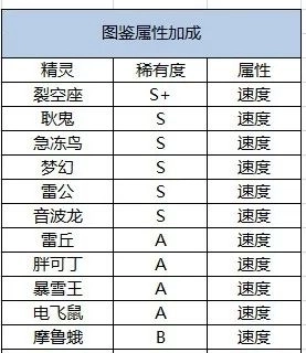 这里的碎片材料来自分解精灵,要是你是游戏大佬,建议把所有精灵都升星而非分解,毕竟精灵升星主要是为了增加图鉴属性,特别是速度属性。下面这张图展示的是目前能加速度的精灵图鉴。