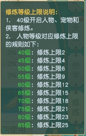 修炼能够提升角色、侠客以及宠物的百分比属性;修炼的上限由人物等级决定。每次进行修炼时,会消耗银币、帮贡、秘参、鹿茸、灵芝等资源。