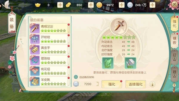 玩家可在游戏界面右下角点击装备按钮,随后能够对装备进行单次强化或连续强化操作,强化过程中会消耗低级玄铁与铁锤这两种材料。装备的星等越高,所需消耗的材料数量就越多;同时,装备星等越高,其带来的属性加成也会相应提升,进而使玩家获得更高的战斗力。