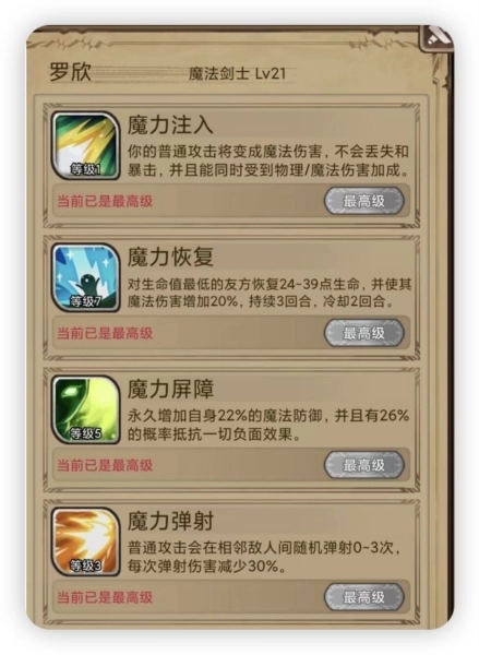 这里镇长的第二页技能可以选法系单体输出(像暗影这类),在魔剑士完成清场后,用来处理那些漏网之鱼。可能有人会疑惑,为什么选法系而不是双加?物理系不也行吗?这是因为大家没注意到魔剑士的魔力恢复效果——它能提升20%法伤,要是加到物理系技能上就白白浪费了。