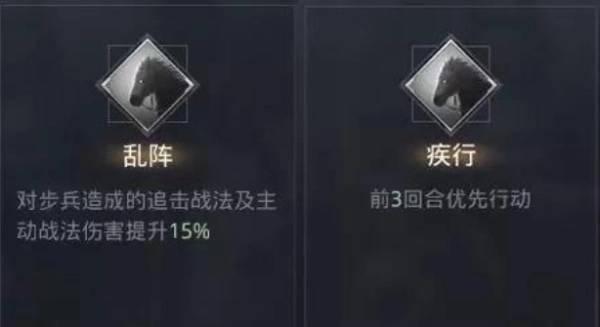 特性方面推荐选择“乱阵”与“疾行”,其中“乱阵”能够增强对步兵单位的主动战法伤害输出,而“疾行”则可让持有者获得行动优先级提升的效果。