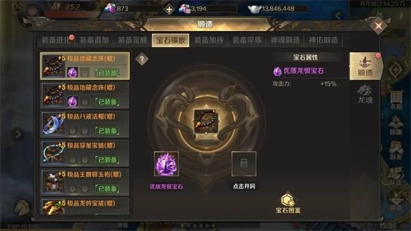 可通过点击“锻造”按钮进入“宝石镶嵌”界面,在此界面中能完成装备开洞以及宝石镶嵌的操作。宝石的品质越好,其为装备附加的属性数值也就越高。