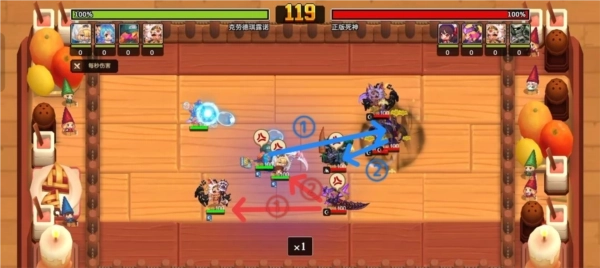 队里中后位置的公主率先打出一套连锁,由于公主处于被嘲讽状态且未被敌方暗刀拦截,敌方暗刀也没能抢到仇恨值,所以这套连锁最终打在了土盾身上。