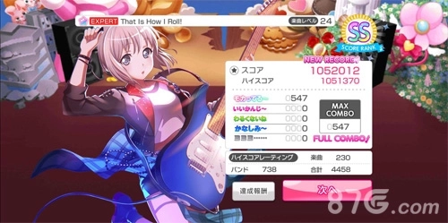 接下来呈现的是成就界面,成就类型包含「分数达标」「达成指定Combo」与「FullCombo」三类,其中后两类成就会匹配不同的难度等级。达成这些成就后,玩家将得到金币、角色升级所需的训练券以及石头等不同奖励。