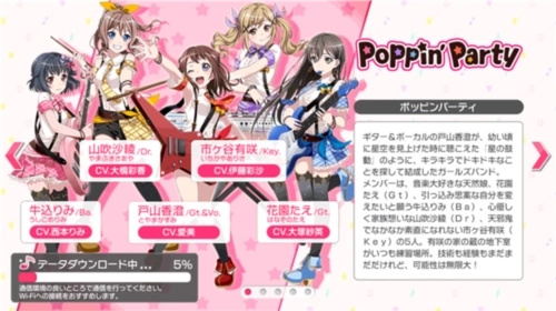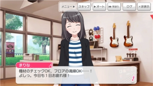 完成后会出现一小段剧情,内容是Poppin'Party各成员进行自我介绍。点击右上角的「メニュー(菜单)」按钮,会弹出「スキップ(跳过)」「オート(自动)」「早送り(快进)」「ログ(记录)」和「非表示(隐藏UI)」五个选项,这和其他视觉小说类游戏的设置是一样的。