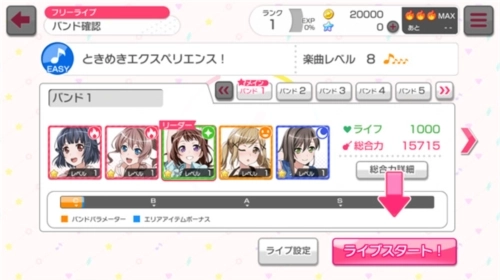 这是确认出场乐队的界面,在这里可以更换出场队伍,也能调整LIVE设定(具体内容后述),如果没有问题,就点击下方的「ライブスタート!」开始。