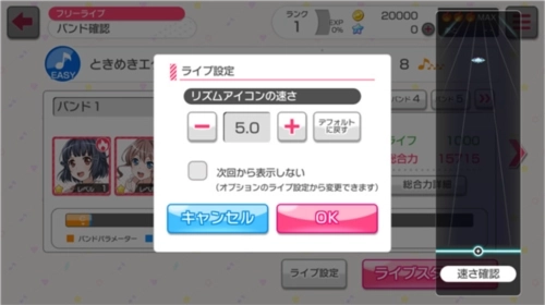 开始前会弹出用于调节下落速度的设定界面,默认值为5.0,右侧是下落速度的预览区域,可根据自身需求进行调整;若已完成调节,点击「次回から表示しない」选项,后续的LIVE就不会再弹出该设定界面了。