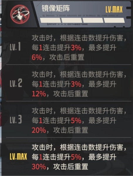 复仇女神的主四级模组是镜像矩阵,该模组和以往其他机兵的增伤模组在效果上存在明显差异。其一,它无需叠层,而是在攻击过程中依据实时连击数来计算增伤数值,这一特性使机兵省去了暖机环节,首次攻击就能触发完整的增伤效果。每达成1连击可获得5%的增伤,仅需6连击就能触发30%的满额增伤,而6连击的要求远低于多数多段攻击武器的连击数,基本不存在触发门槛。不过,该模组的重置机制为“攻击后重置”而非回合结束重置,这在一定程度上限制了其强度,意味着每次发起攻击都需要重新积累连击数。