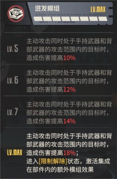 复仇女神的八级模组属于迸发类型,这是专门为配备双持背部与手部武器的机兵设计的模组。其增伤比例为常规的18%,因此我们需要重点关注的是它的触发条件以及特殊效果。